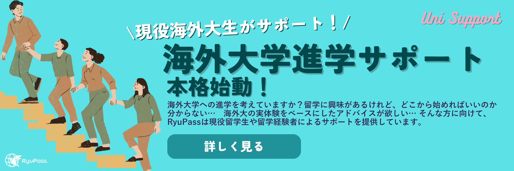また、留パスの『留サポ』サービスでは現役の海外大生による留学サポートを行っています。留サポでは、アメリカ、イギリス、カナダなどの有名海外大学に通う学生が、あなたの留学準備をサポートします。